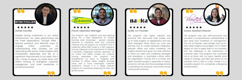 SH Retail Academy (SHRA) is a retail training provider founded and inspired by the intention of Mr Lim Kim Heng, Executive Chairman of Senheng New Retail Berhad, to support Malaysian retail industry to grow by increasing productivity through digitalisation and upskilling. SHRA specialize in retail related topics such as New Retail, Sales Skills, Customer Service and even soft skills such as Leadership and